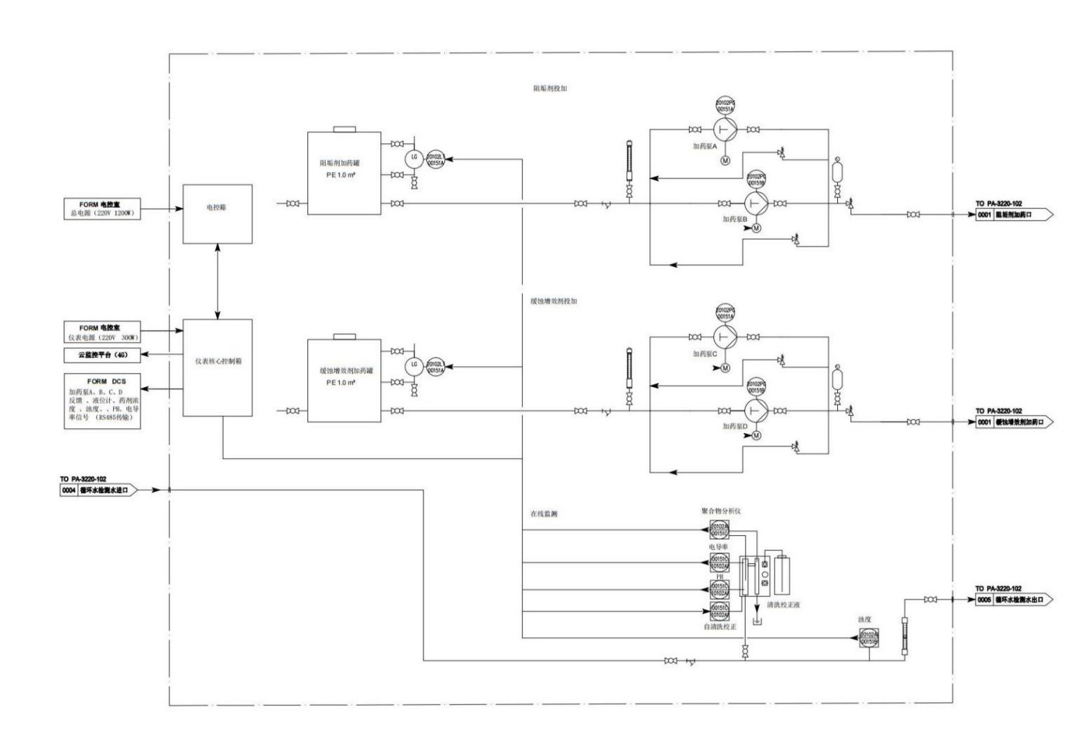 通过聚合物分析仪器,利用显浊比色法来确定聚羧酸类化合物的含量,从而确定系统中无磷药剂的浓度。通过核心控制器将药剂浓度数据,及水质多参数数据(ORP、电导、PH、余氯等)标定测准后反馈至自动控制模块,实现5套系统的自动加药。采用智慧平台实现远程控制和智能管理,对全厂的循环水系统实现综合评价和主动预警。